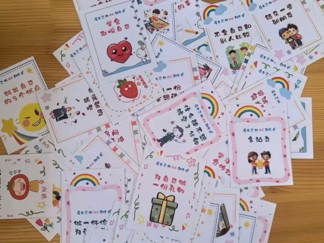 突破传统说教式心理健康教育,以“爱自己的 100 种方式”卡牌为媒介,为学生提供丰富多样的自我关爱实践路径。通过随机抽取,增加活动趣味性与探索性,促使学生在多样化微小行动中深度理解并践行“爱自己”理念,实现自我关怀意识从理论到实践的转化。