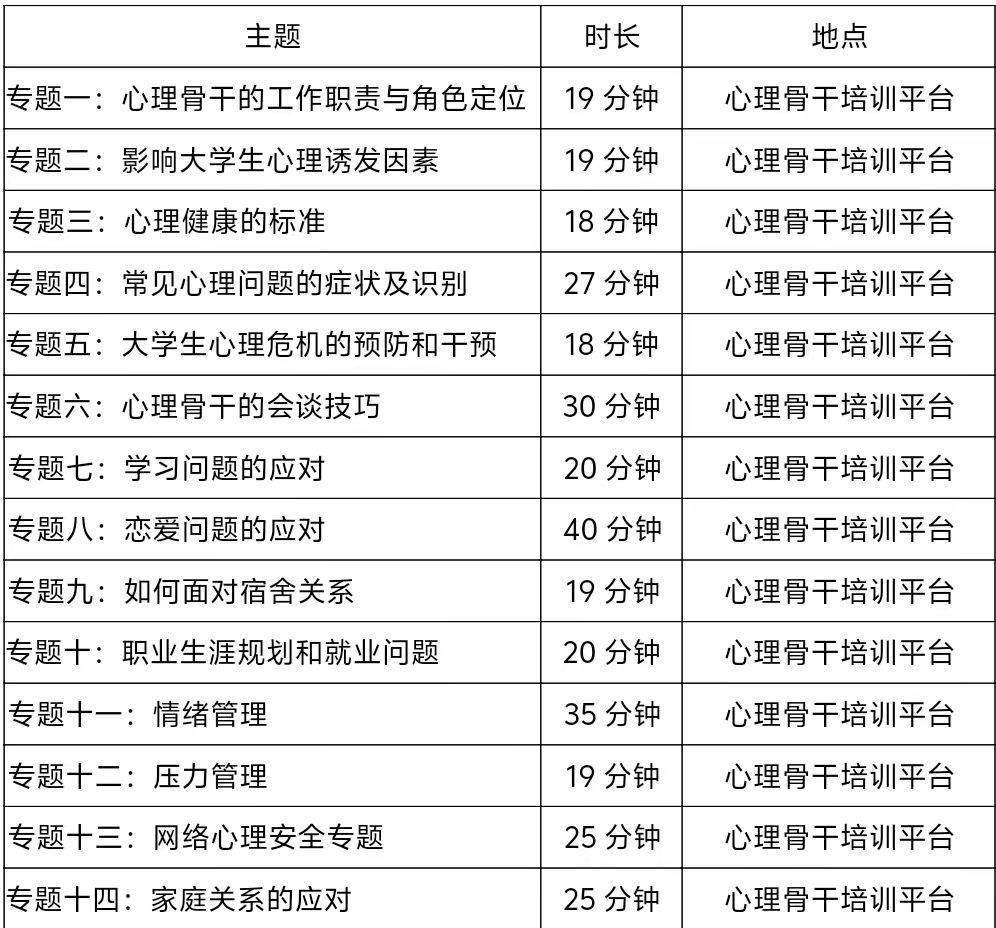 (1)线上课程:采用高校心理委员平台推出的心理委员系列课程,具体如下表: