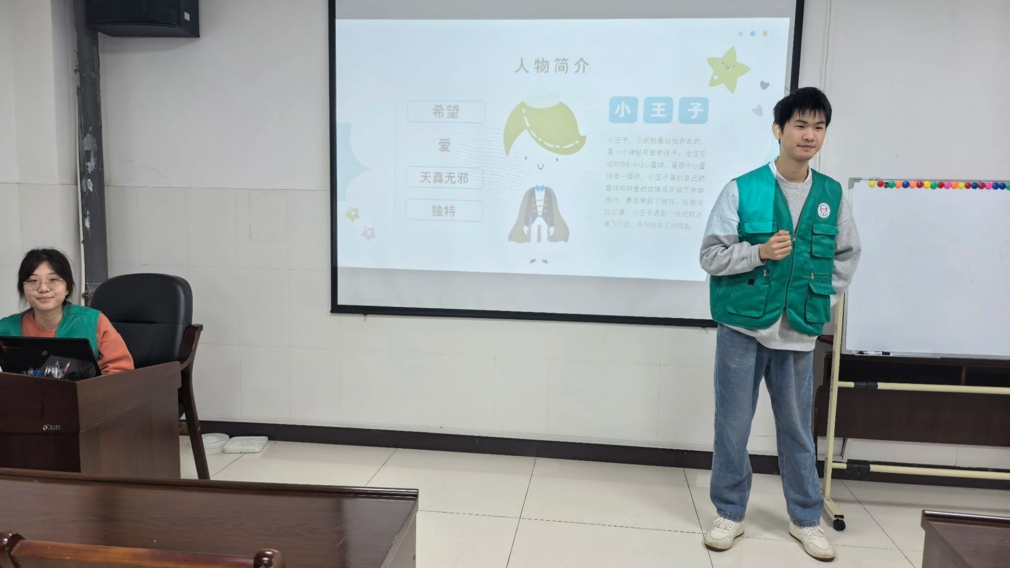 志愿者张腾迪则结合《小王子》故事,与大家共同阅读主人公与狐狸、玫瑰的经历。通过分析狐狸与玫瑰的性格特点,她鼓励大家打破刻板印象,勇敢回归本真、积极向前。