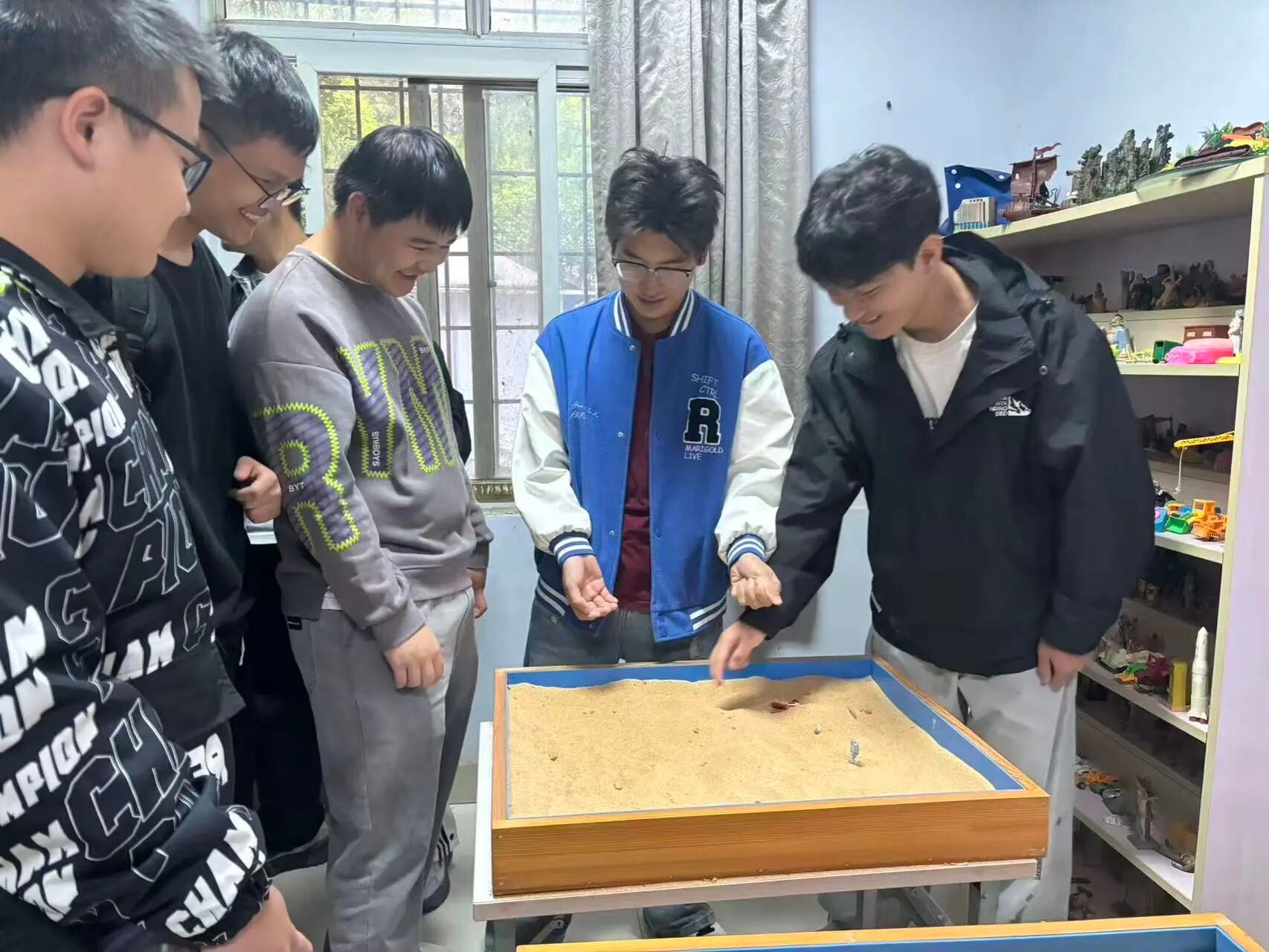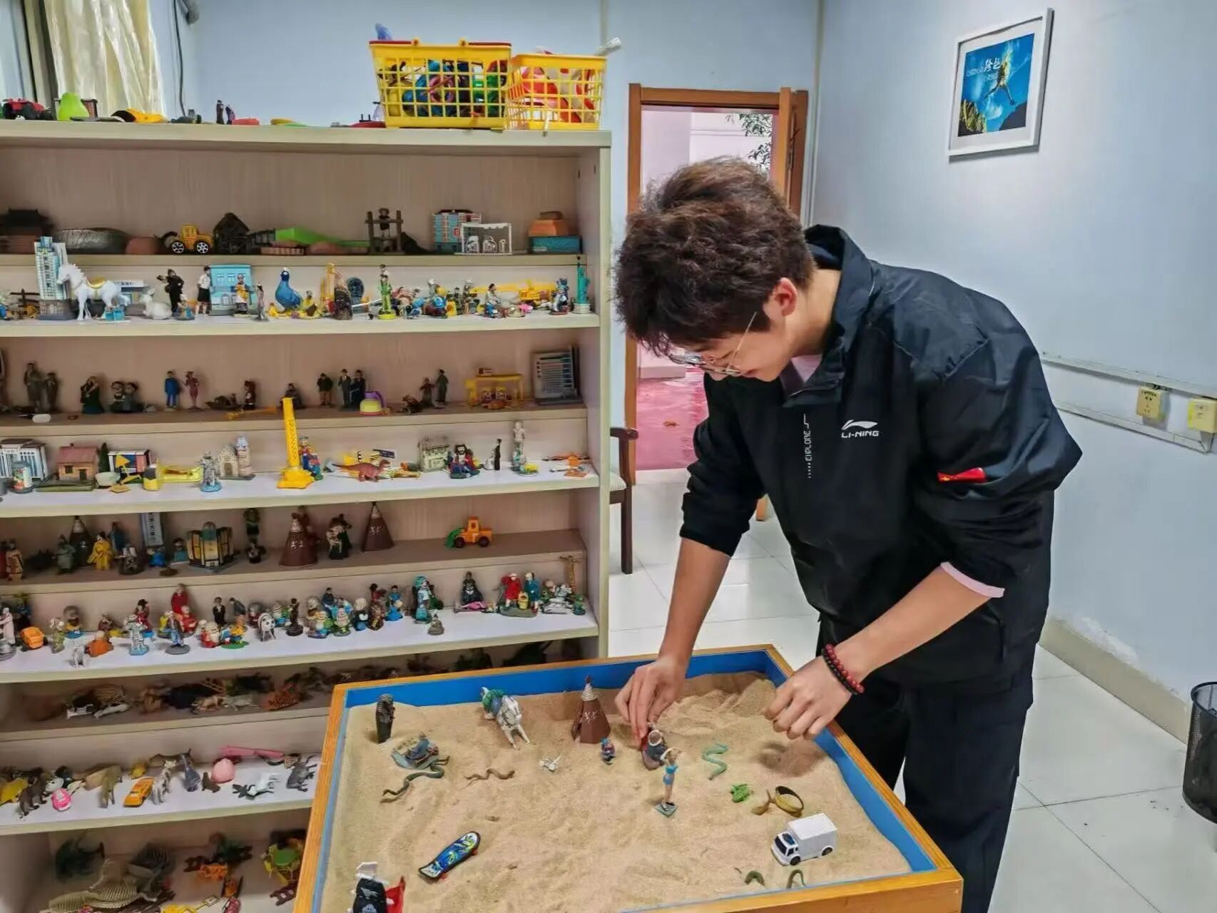沙盘游戏室激发了同学们浓厚的兴趣。在沙盘游戏室,大家了解到如何通过摆放沙具探索内心世界,表达潜意识情感。来自政法学院的王欣悦说到走进心理健康中心看到沙盘觉得这里像个能卸下疲惫的“心灵驿站”。虽然没有经过系统的咨询,但能感受到这里传递的关怀,心理健康也需要被这样认真对待,希望更多人能在这里找到内心的平静。在这里,脆弱不用伪装,倾诉也不会被评判,离开时手里的小礼物,成了心里一份柔软的支撑。新生边摆放沙具边说:“这就像是一场与自己内心的对话,我能更清楚地感受到自己的想法和情绪。