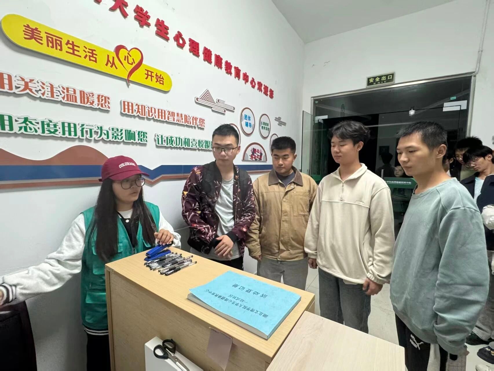 新生来到心理中心,我们的讲解员会依次带领大家参观预约接待室、团体咨询室、情绪宣泄室、沙盘游戏室等多个功能区域。每到一处,讲解员都会详细介绍该区域的功能、设备用途以及如何借助这些资源维护自身心理健康。让我们走进大学生心理健康教育中心,直击活动现场吧~