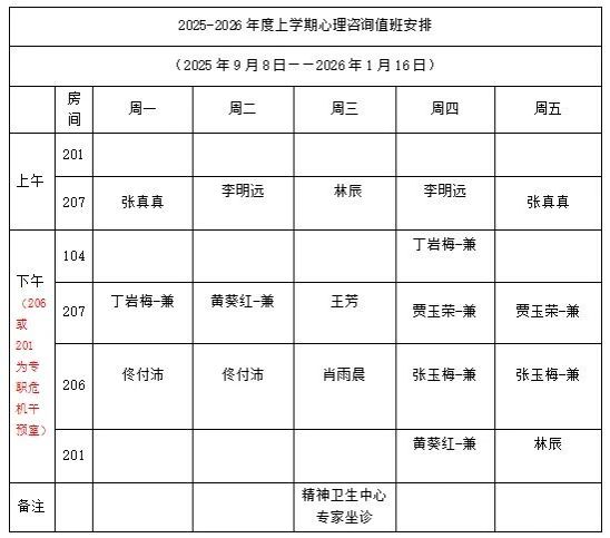 隆中校区2025-2026年度上学期心理咨询值班安排