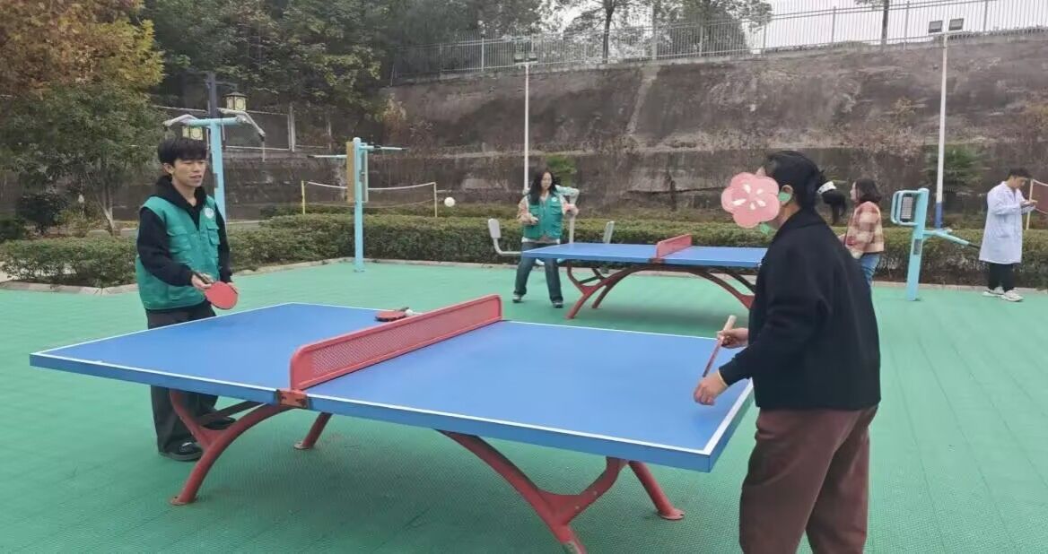 11月12日下午,湖北文理学院“心光守护”联盟志愿服务队走进襄阳市安定医院,开展乒乓球疗愈课程。志愿者苏梦浦和伊韩玥耐心引导,带领患者在方寸桌台间感受乒乓跃动的节奏