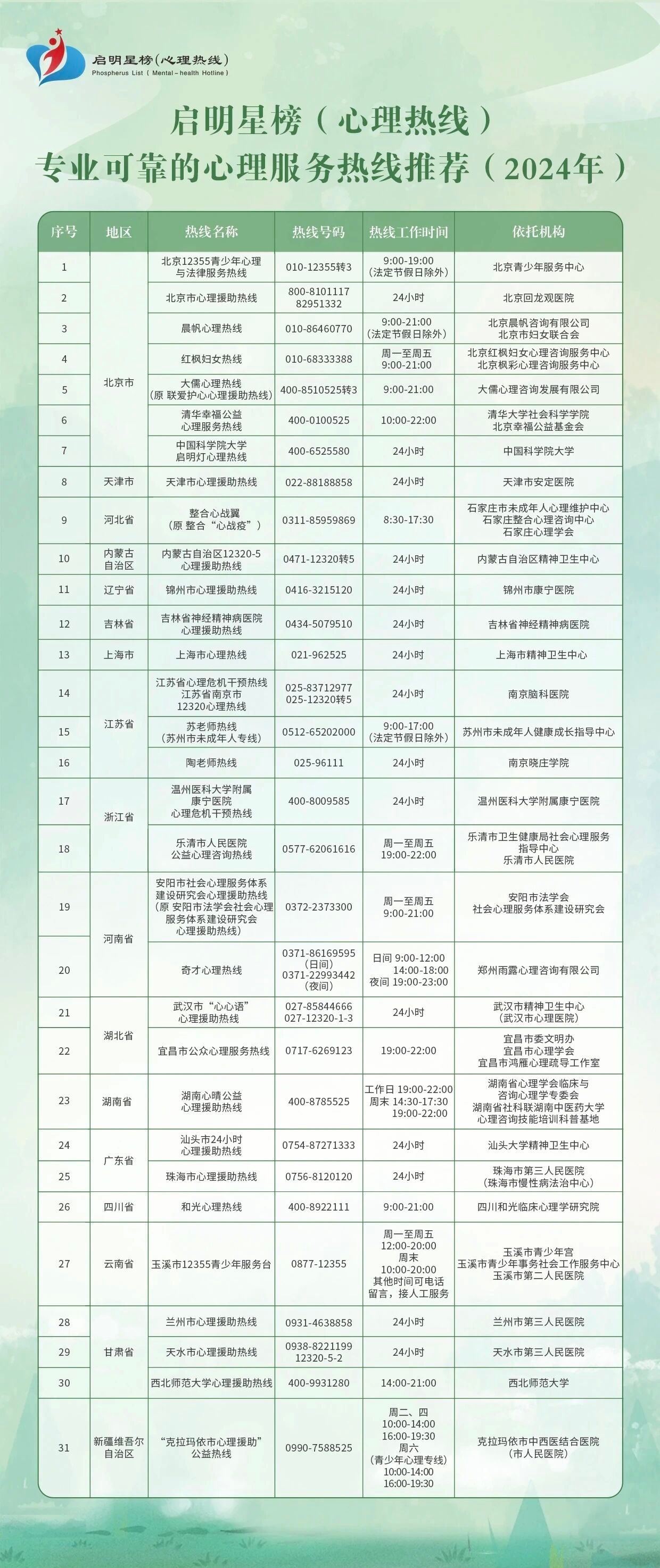 湖文er们,这里有一些服务规范、服务质量较高的热线被列入“启明星榜(心理热线)”予以公布,榜单中的热线按地区排序,大家在暑假期间也可以拨打专业的心理服务热线。