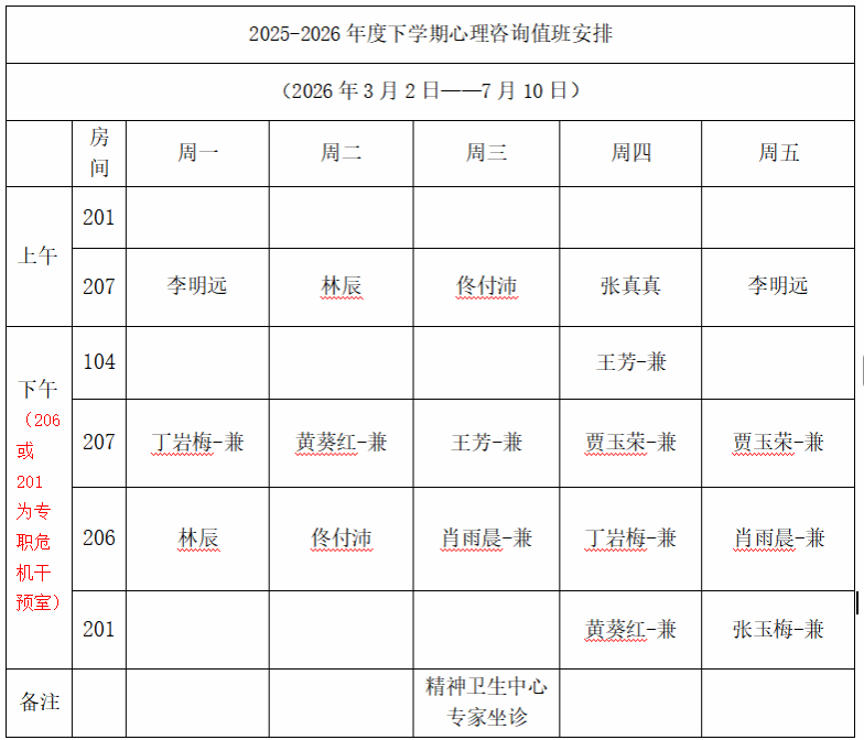隆中校区2025-2026年度下学期心理咨询值班安排