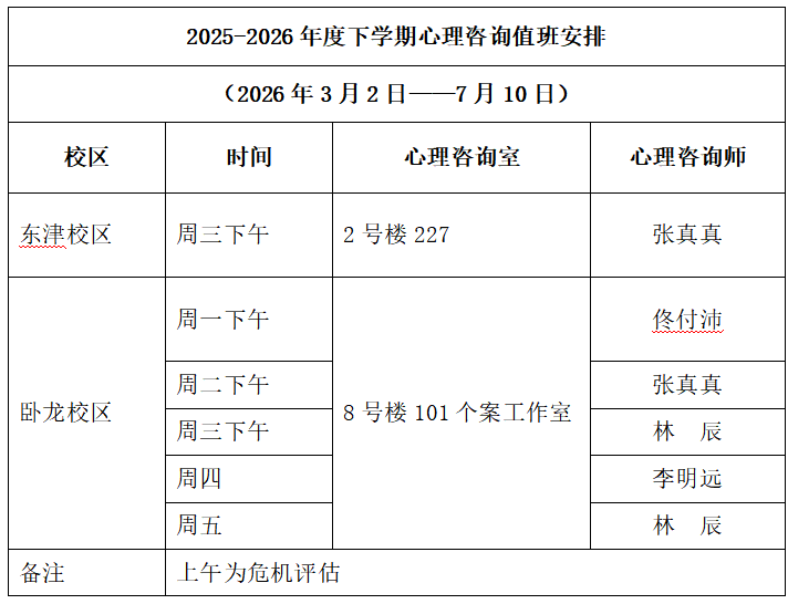 东津校区与卧龙校区2025-2026年度下学期心理咨询值班安排