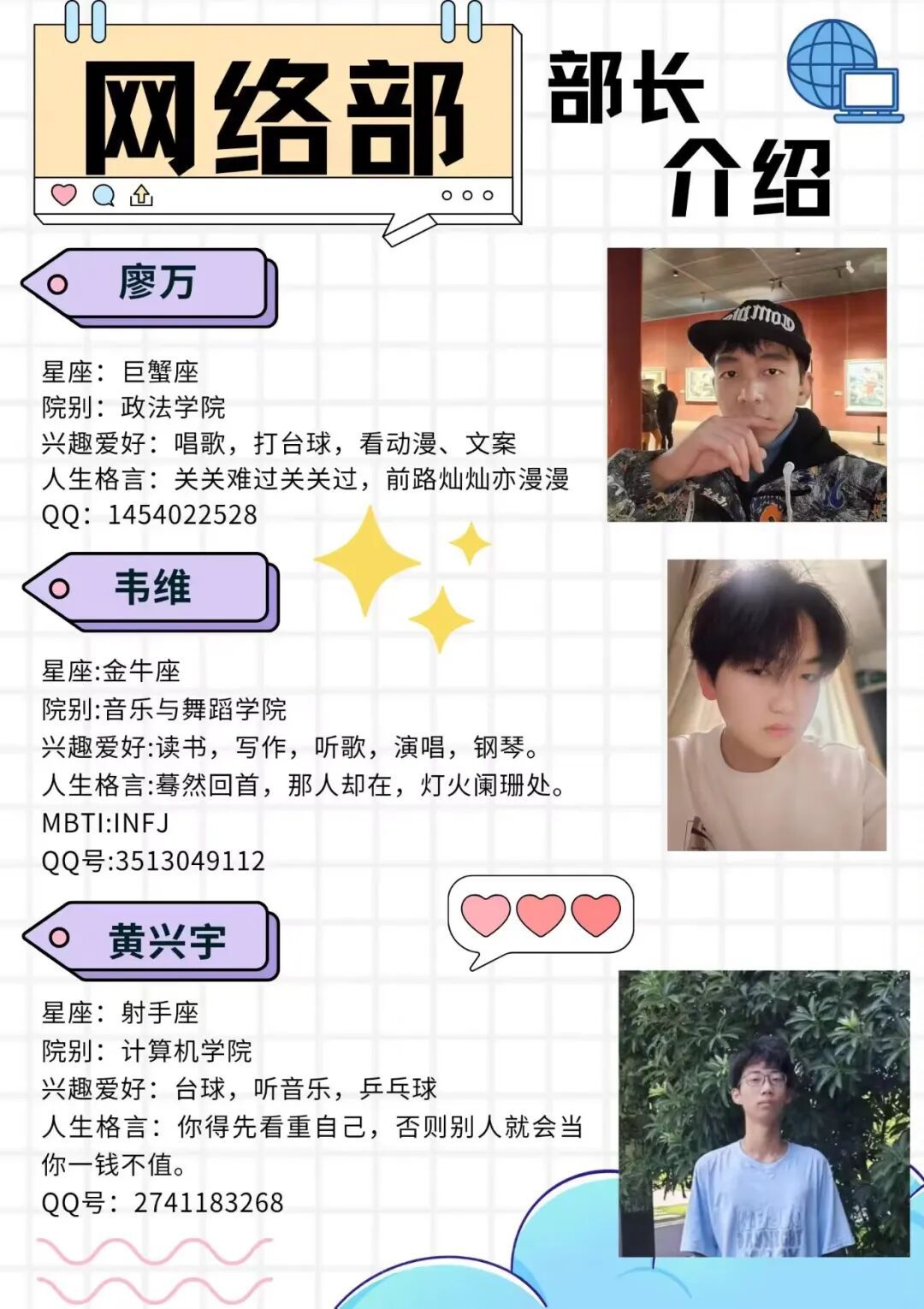 青春同行,成长同路~三位部长已备好热忱与专业,期待和大家在网络部碰撞灵感、并肩奋进!想解锁校园网络新玩法、用创意点亮数字天地?多多关注我们,心动就大胆加入,一起书写属于我们的精彩故事,让热爱在网络部闪闪发光