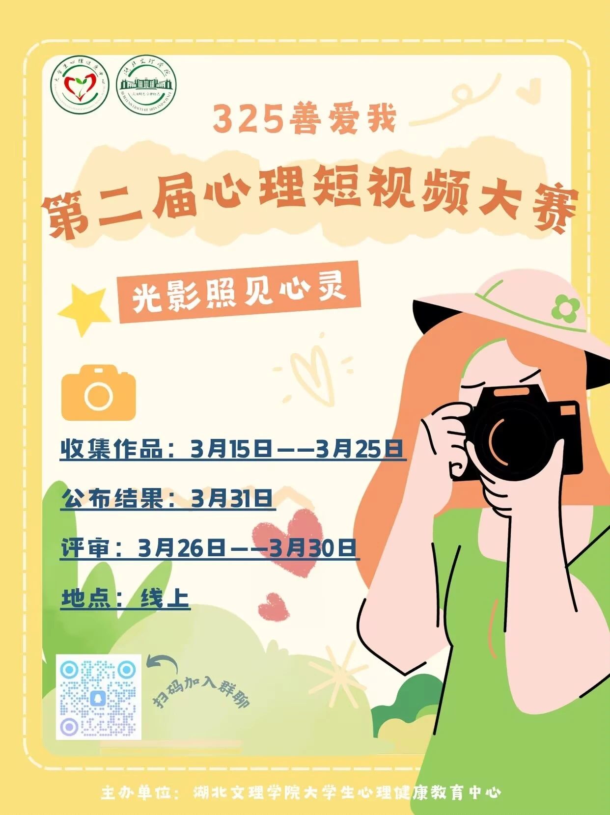 “325善爱我”倡导大学生在春日之际关爱自我、关注内心成长。面对快节奏校园生活,青年学子常忙于向外追逐而忽略情绪关照。为此,湖北文理学院大学生心理健康教育中心举办“光影照见心灵”心理微视频大赛,鼓励学生用镜头记录真实情绪、定格成长瞬间。活动旨在以影像为媒,引导学生在创作中完成自我对话,让“善爱我”的理念在光影交织中落地生根。