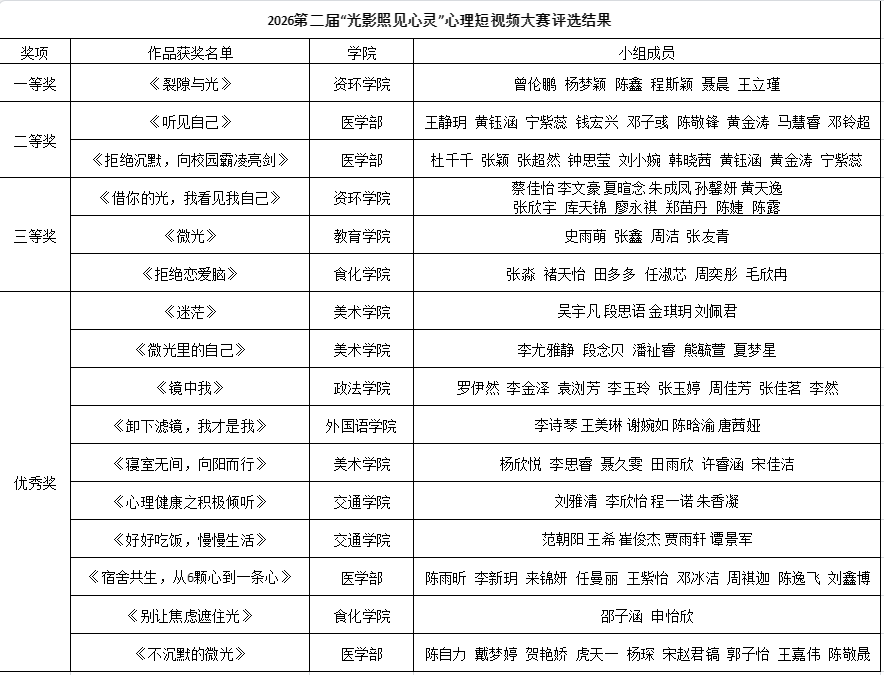 我校于2025年3月15日至25日举办"光影照见心灵"心理短视频大赛,此次活动旨在通过生动影像传播心理健康知识,提升学生心理健康素养。经评选,现将获奖名单公布如下:
