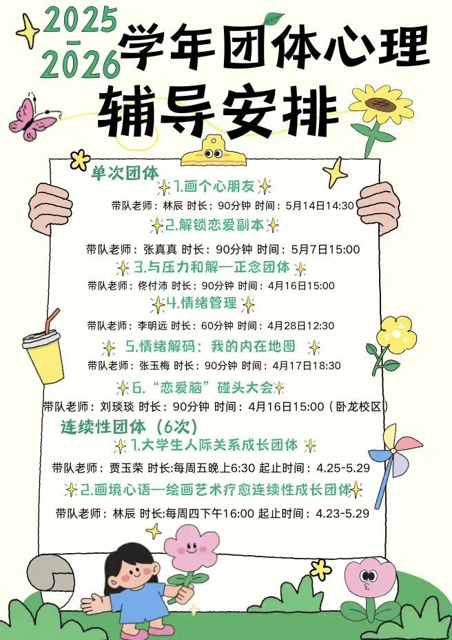 哈喽~各位亲爱的湖文er们,我校心理中心近日推出“春日心语·共赴成长”积极心理品质培育系列团体心理辅导活动啦~春光明媚,万物复苏,正是心灵拔节生长的最好时节。在这个充满生机与希望的季节里,你是否也期待一场与自我对话、与成长相遇的温暖旅程?快来看看吧!下方已经为大家准备好了不同主题的报名二维码,找到最打动你的那一个,轻轻点击扫码加入QQ群,因各组名额有限,大家先到先得哦~